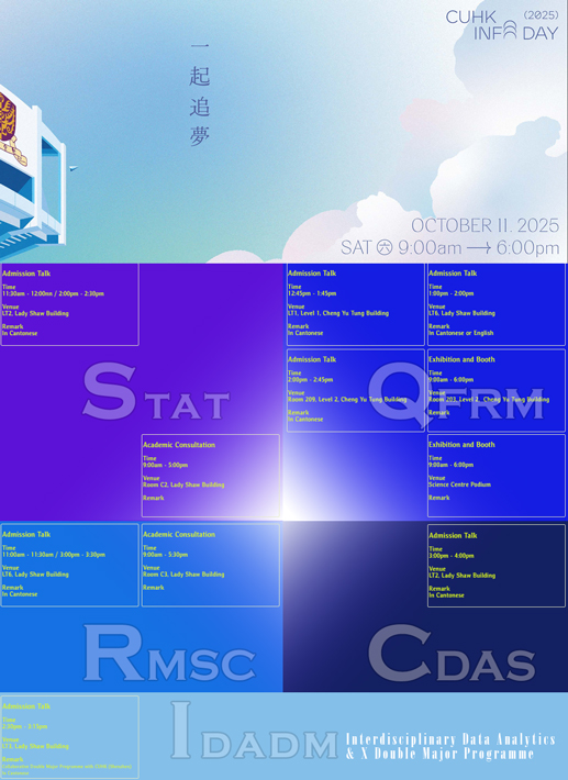 Details: | Sessions of admission talk and academic consultation of majors of our department are shown above. More information on Information Day can be found at https://infoday.cuhk.edu.hk/. |